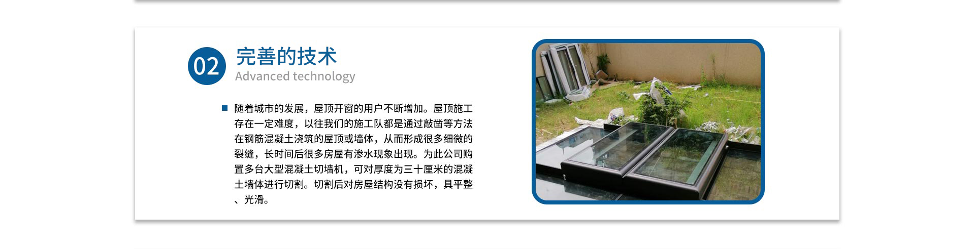 奉獻(xiàn)給客戶(hù)的不僅是一種產(chǎn)品,更是一種家居理念,一種生活文化。隨著城市的發(fā)展,屋頂開(kāi)窗的用戶(hù)不斷增加。屋頂施工存在一定難度,以往我們的施工隊(duì)都是通過(guò)敲鑿等方法在鋼筋混凝土澆筑的屋頂或墻體,從而形成很多細(xì)微的裂縫,長(zhǎng)時(shí)間后很多房屋有滲水現(xiàn)象出現(xiàn)。為此公司購(gòu)置多臺(tái)大型混凝土切墻機(jī),可對(duì)厚度為三十厘米的混凝土墻體進(jìn)行切割。切割后對(duì)房屋結(jié)構(gòu)沒(méi)有損壞,具平整、光滑。也是天窗開(kāi)洞口,混凝土墻體開(kāi)門(mén)洞,開(kāi)樓梯洞等等的好選擇。另外提供天窗維修業(yè)務(wù)。